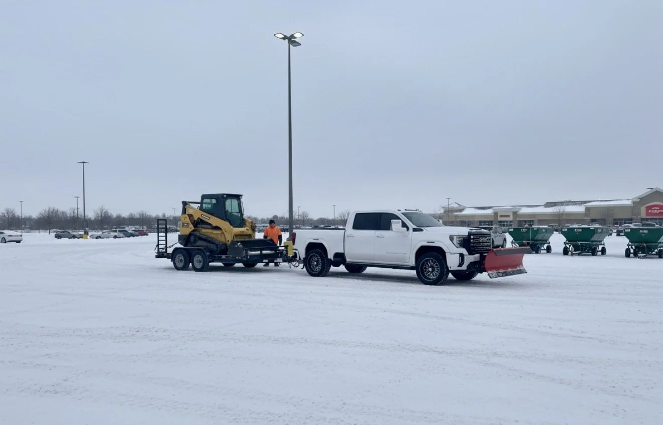 A white pickup truck with a red snow plow attached to the front is towing a trailer carrying a yellow skid-steer loader in a snow-covered parking lot. A worker in an orange jacket stands next to the trailer, and there are several green carts and parked cars in the background under an overcast sky.